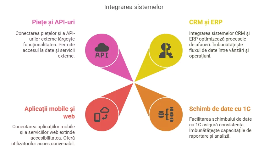 Creăm legături puternice între site-urile web, CRM, ERP și sistemele contabile bazate pe 1C, astfel încât datele să circule rapid și fără erori. Nu mai trebuie să duplicați manual informațiile sau să pierdeți timp căutând date actualizate. Totul este sincronizat automat - solduri, statusuri, comenzi, plăți, cereri.